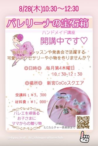 木曜日の午前は「バレリーナの宝石箱」。バレリーナの衣装に使うアクセサリーを製作するお教室です。専門学校の講師も務めるいつも優しい雰囲気で教えてくれる葉子先生✨