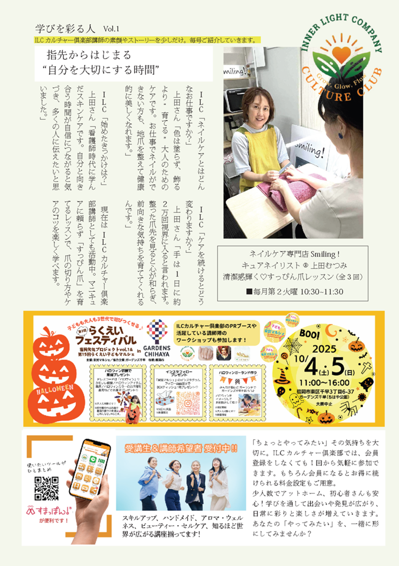 今号から新連載がスタート。「学びを彩る人」第1回は、ネイルケア専門家・上田むつみさん(ネイルケアサロン Smiling!)にインタビュー。看護師からネイリストへの転身、自爪ケアの奥深さ、そしてILCカルチャー俱楽部での講師としての想いが語られています。