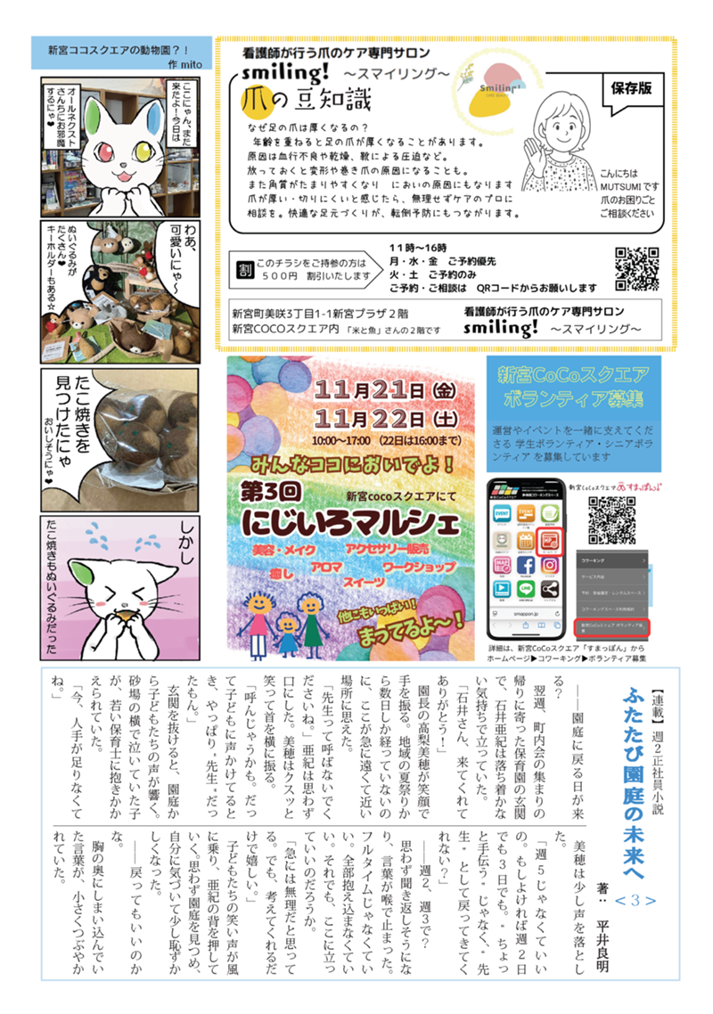 今月号も、新宮CoCoスクエアを中心に展開されるさまざまな活動や人々の思いを、ぎゅっと詰め込んだ内容となっています。紙版は施設内で配布中、PDFでもご覧いただけます。どちらの形でも、ぜひ手に取ってお楽しみください。