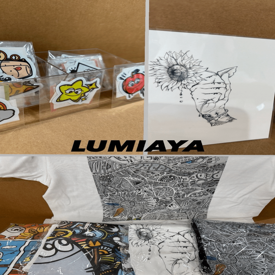 オリジナルデザインのTシャツやステッカーなど、個性あふれるグッズが並びます。