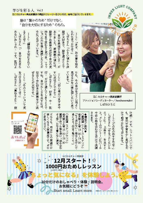 「学びを彩る人」第3回は、ファッションコーディネーター/しばたひろこさんにインタビュー。ILCカルチャー俱楽部での講師としての想いが語られています。