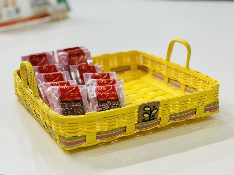 ちなみに写真のようなクラフトバンドのかごは、 参考価格で1,800円ほどとのこと。 こうしたかごとお菓子を組み合わせると、贈り物としても素敵ですね。