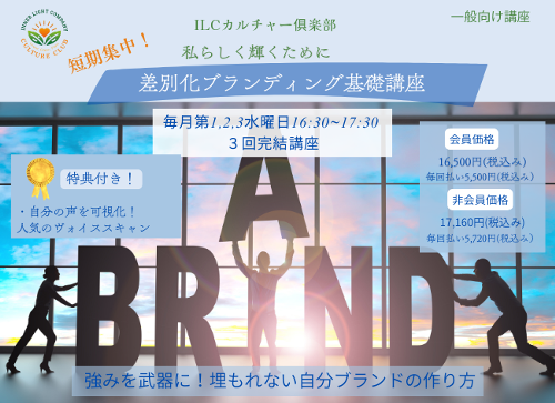 アクションコース~差別化ブランディング実践講座【3ヶ月完結講座】 60分 ¥ 5,500(税込) 料金詳細承認制自分の強みを行動に!選ばれる自分ブランドの伝え方 ■開講日 毎月第4月曜16:30~17:30 ■受講料 会員価格 毎回払い5,500円(税込) 16,500円(税込)※カルチャー倶楽部会費月300円ですべての講座が会員価格で受講可能 非会員価格 毎回払い5,720円(税込) 17,1...