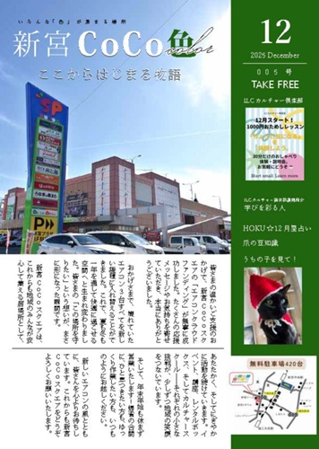 フリーペーパー『新宮CoCo色』12月号 発行のお知らせ地域の学びとつながりを応援する、新宮CoCoスクエア発のフリーペーパー『新宮CoCo色』。 2025年12月号(第5号)が完成しました。今月号も、新宮CoCoスクエアを中心に展開されるさまざまな活動や人々の思いを、ぎゅっと詰め込んだ内容となっています。紙版は施設内で配布中、PDFでもご覧いただけます。どちらの形でも、ぜひ手に取ってお楽しみくだ...
