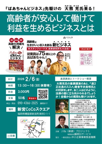 高齢者が安心して働けて、利益を生めるビジネスとは──『ばあちゃんビジネス』先駆けの大熊充氏を迎えて少子高齢化が進むなかで、「高齢者=支えられる側」というイメージは、今も強く残っています。 けれど本当に、それだけなのでしょうか。今回、新宮CoCoスクエアでは 『ばあちゃんビジネス』の先駆者であり、株式会社うきはの宝 代表取締役の 大熊 充 氏 をお招きし、 「高齢者が安心して働き、社会に参加し、きち...
